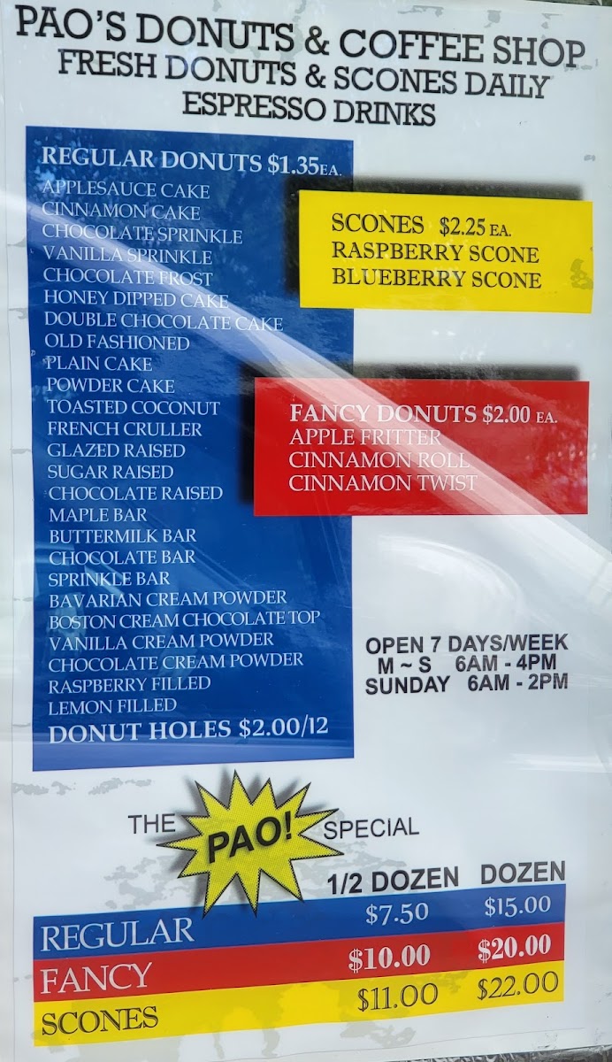 Pao's doesn't just stop at donuts; their scone selection includes scrumptious blueberry and raspberry scones, offering a perfect companion to your morning coffee. The atmosphere is cozy and inviting, with a charming decor that harkens back to simpler times, as noted by regulars who delight in the old-fashioned feel of the shop.